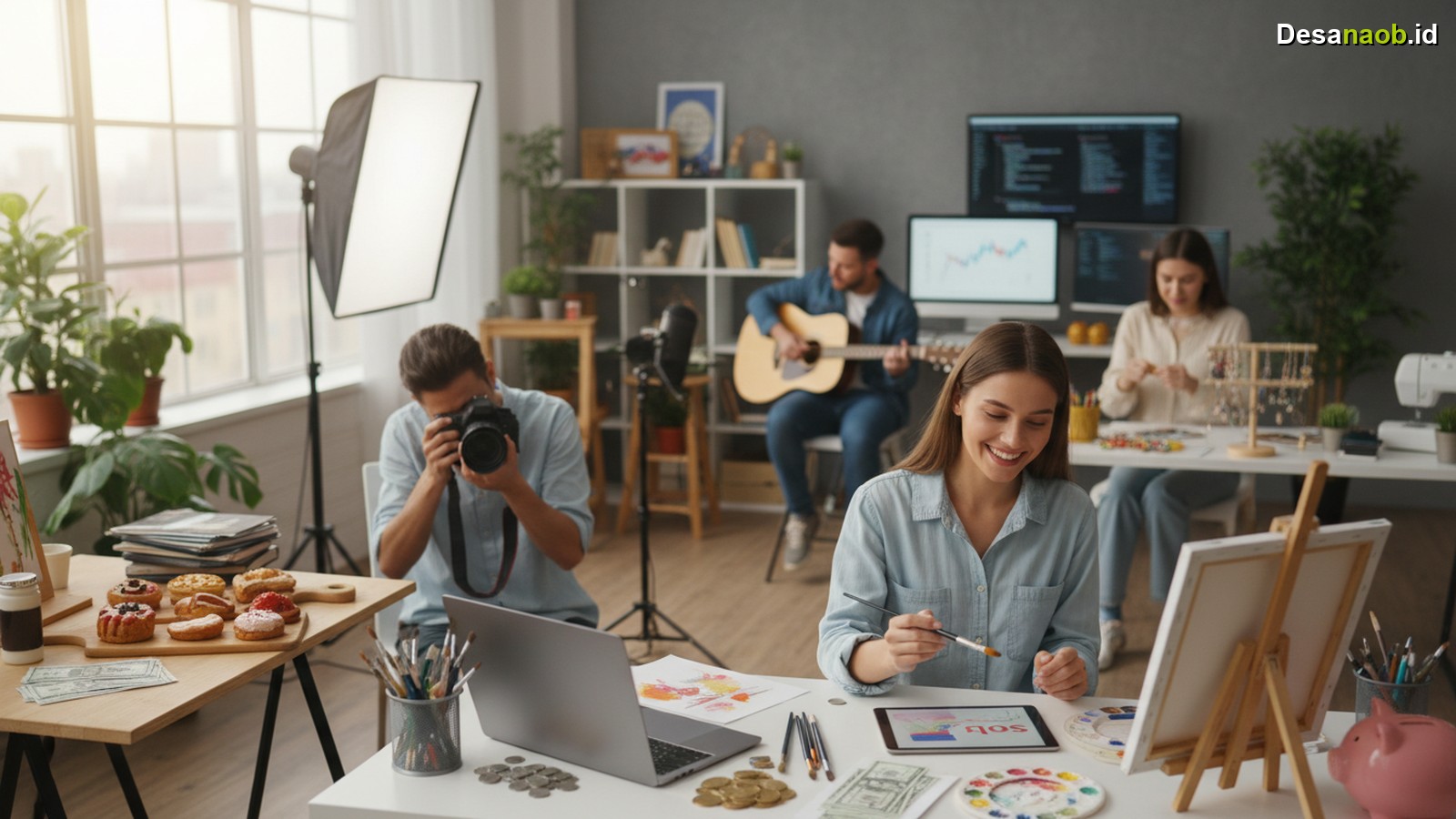 4. Freelance berbasis hobi — Hobi desain grafis, musik, atau editing video sangat laku di platform freelance seperti Fiverr, Fastwork, dan Projects.co.id.